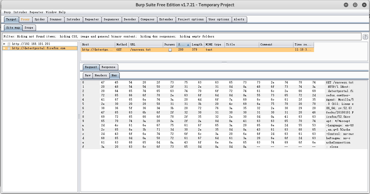 使用浏览器访问网页,则在Burpsuite栏目Target栏目下可以发现内容
